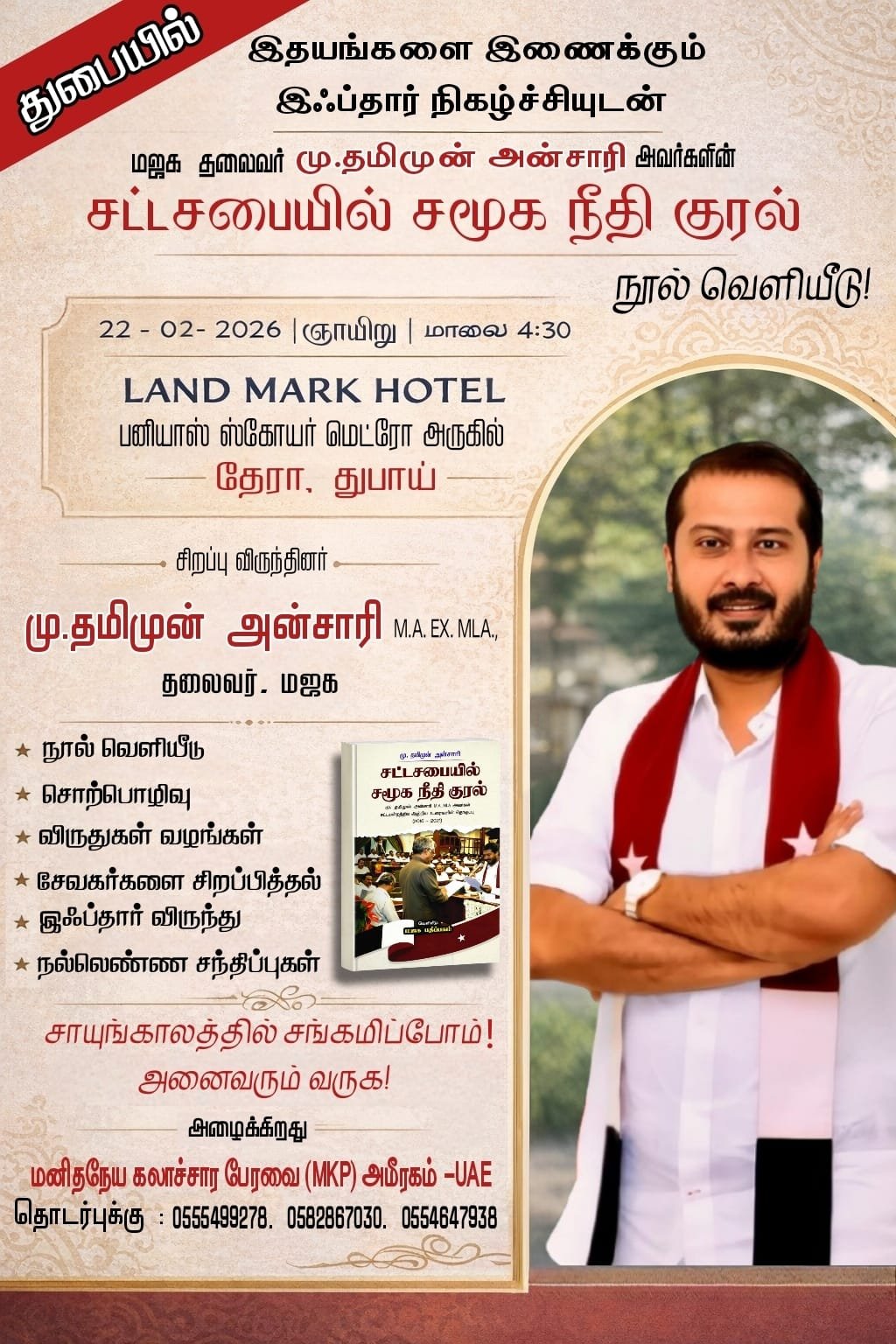 தமிழ்நாடு அரசியல் வரலாற்றில் முக்கிய ஆவணமாகப் பார்க்கப்படும் புதிய நூல் ஒன்று வெளியாகிறது. மனிதநேய ஜனநாயகக் கட்சி தலைவர் மு. தமிமுன் அன்சாரி அவர்கள் 2016 முதல் 2021 வரை சட்டமன்றத்தில் ஆற்றிய உரைகளின் தொகுப்பாக “சட்டசபையில் சமூக நீதி குரல்” என்ற நூல் வெளியிடப்படுகிறது.