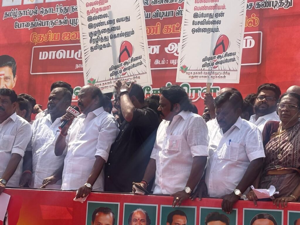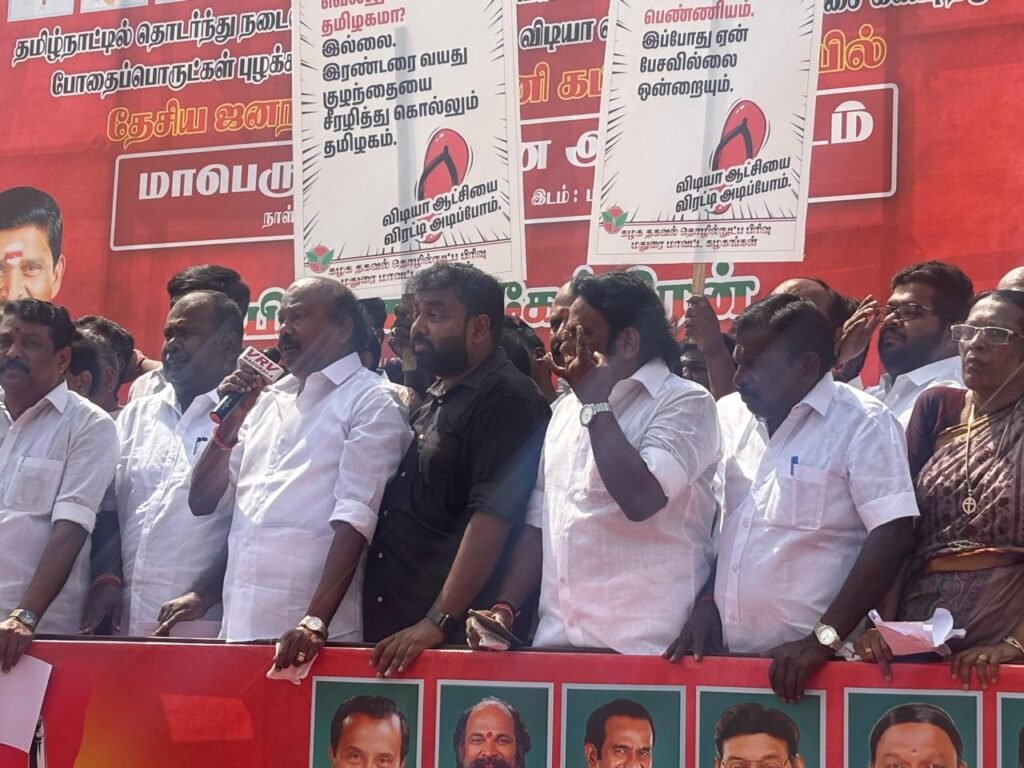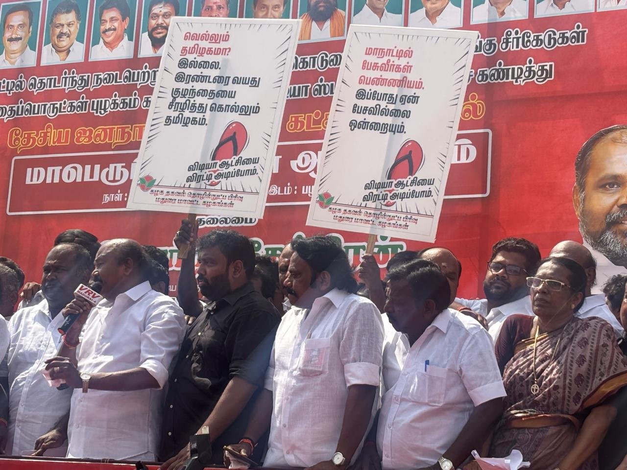தமிழ்நாட்டில் பெண்களுக்கு எதிராக தொடர்ந்து நடைபெற்று வரும் பாலியல் குற்றங்களை கண்டித்து அனைத்திந்திய அண்ணா திராவிட முன்னேற்றக் கழகம் தலைமையில் கண்டன ஆர்ப்பாட்டம் நடைபெற்றது. இந்திய கூட்டணியில் உள்ள பல கட்சி தலைவர்கள் மற்றும் நிர்வாகிகள் இந்த ஆர்ப்பாட்டத்தில் கலந்து கொண்டு தங்களது எதிர்ப்பை வெளிப்படுத்தினர்.